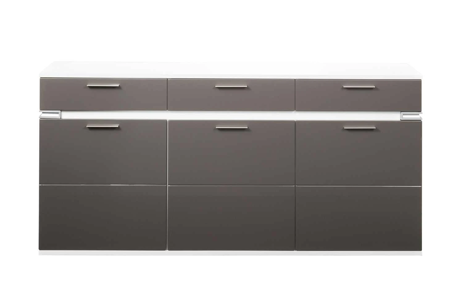 Erweitern Sie den Stauraum im Wohn- oder Esszimmer mit dem Sideboard Katt von uno. Im oberen Bereich stehen Ihnen drei Schubladen zur Verfügung. Praktisch: Sie sind mit einem Selbsteinzug und einer Soft-Close-Funktion ausgestattet und schließen so langsam und geräuscharm. Im unteren Bereich sind drei Türen zu finden. Hinter jeder der Türen stehen Ihnen zwei Fächer zur Verfügung. Neben seiner praktischen Seite ist Katt auch attraktiv designt. Hauptaugenmerk ist der Kontrast zwischen Front und Korpus. Die Front fällt durch ihren stylischen Hochglanz in Graphitgrau auf. Seitliche LEDs bringen die Front noch besser zur Geltung. Sie sind im Lieferumfang enthalten.