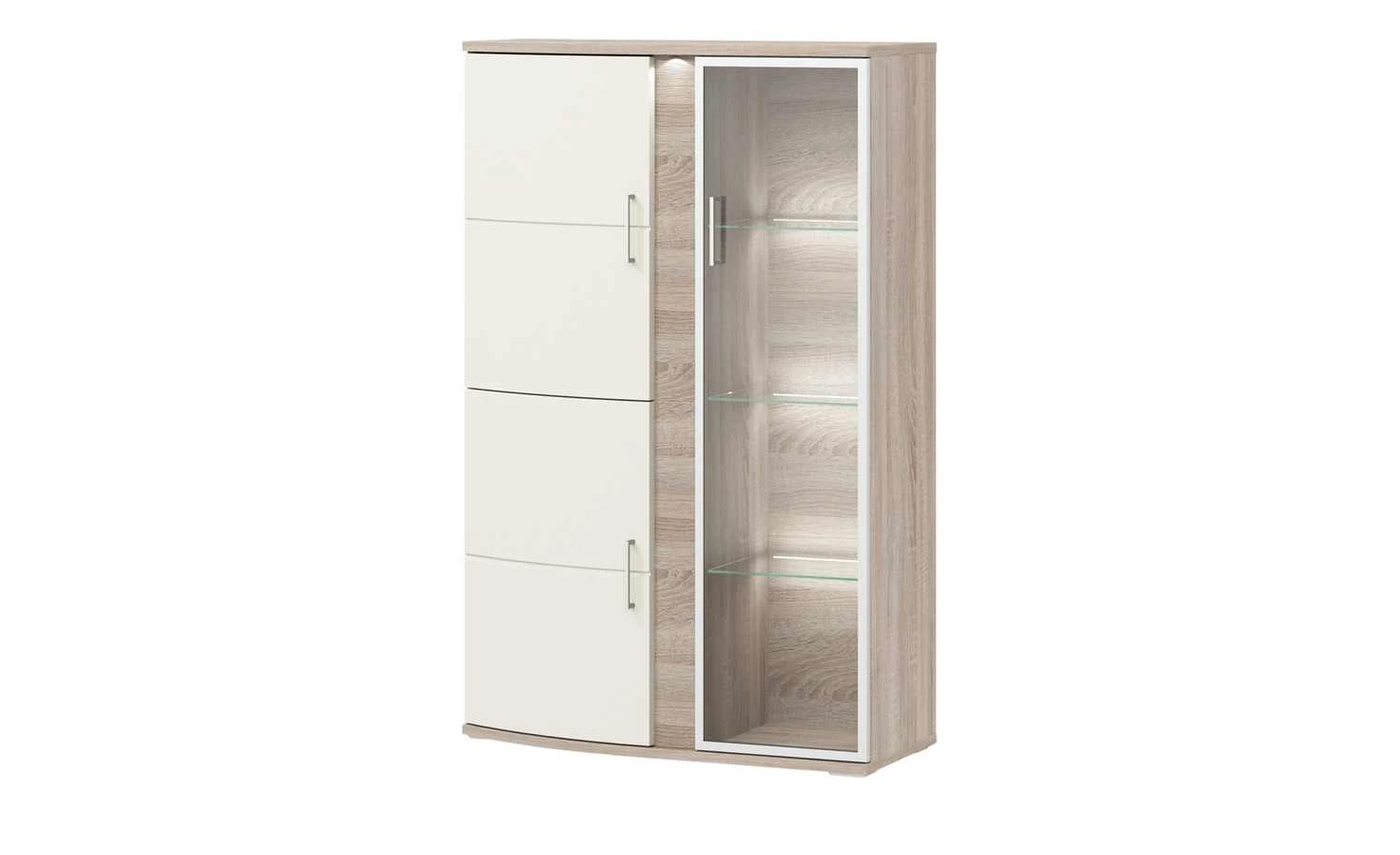 Die Vitrine Onyx von uno ist ein zweifaches Highlight. Sie bietet einsehbaren, aber auch nicht einsehbaren Stauraum. Eine der drei Türen aus Klarglas mit einem schmalen Alurahmen. Durch das Glas können Sie in die vier Vitrinenfächer sehen, die durch Glasböden voneinander getrennt sind. Hier ist genügend Platz, um Porzellan, dekorative Gläser und Urlaubssouvenirs zu präsentieren. Hinter den anderen beiden – nicht einsehbaren – Türen befindet sich weiterer Platz in vier Fächern. Onyx ist aber nicht nur praktisch, sondern auch dekorativ. Der Korpus in Holzoptik wird durch die Front in einem Vanilleton (Creme) abgesetzt. Ein edles Hochglanzfinish sorgt für tolle Effekte. Mittig zwischen den Türen befindet sich eine Absetzung in Korpusoptik, die durch ihre geriffelte Oberfläche auffällt. Sie wird durch die Frontbeleuchtung toll in Szene gesetzt.