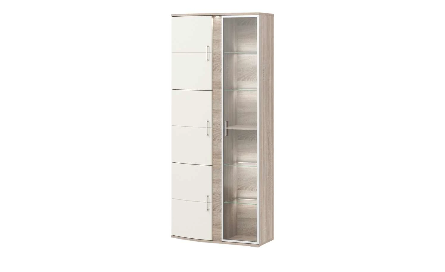 Die Vitrine Onyx von uno bietet zweigeteilten Stauraum. Eine Seite ist mit Glas abgesetzt und einsehbar. Die andere Seite verfügt über nicht einsehbaren Stauraum. Pro Seite sind sechs geräumige Fächer zu finden, die Sie vielseitig nutzen können. Die Vitrinenfächer sind zum Beispiel super, um Porzellan oder dekorative Accessoires zu präsentieren. Onyx ist größtenteils in einem attraktiven Holzdekor (Nachbildung) designt. Die Optik wird mittig an der Front aufgegriffen, hier allerdings mit einer geriffelten Oberfläche. Der Rest der Front setzt sich in Klarglas mit Alurahmen und in Vanille (Creme) ab. Die Farbe kommt dank der Hochglanzoberfläche noch besser zur Geltung. Eine Frontbeleuchtung setzt zusätzliche Akzente.