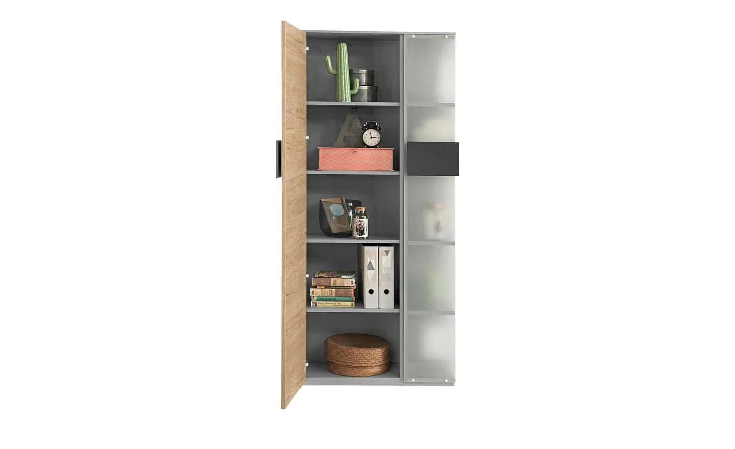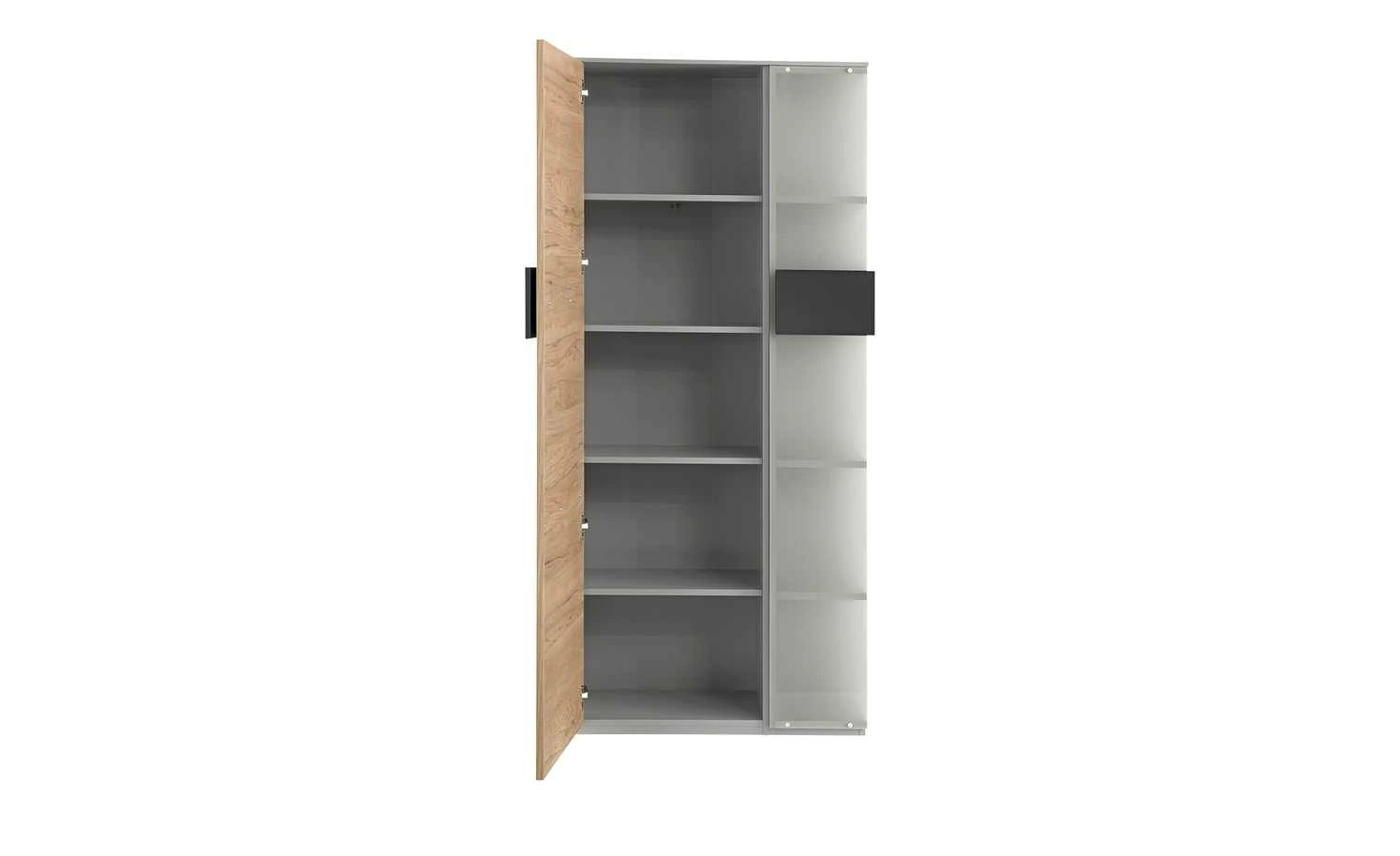 - Mehr zu Ausstattung / Funktion: Drehtür mit Metall-Topfbandscharnieren mit 110 Grad Öffnungswinkel, 3 Böden hinter der Glasfront, Regal mit Geheimfach, Front: 19 mm stark mit ABS-Kante, Korpus: 16 mm stark mit Dekorkante, 4 Böden hinter der Tür