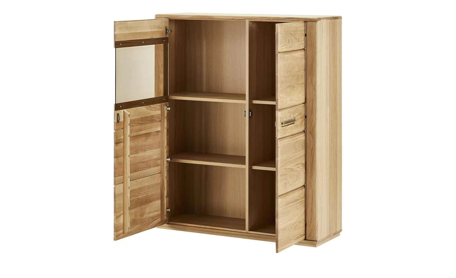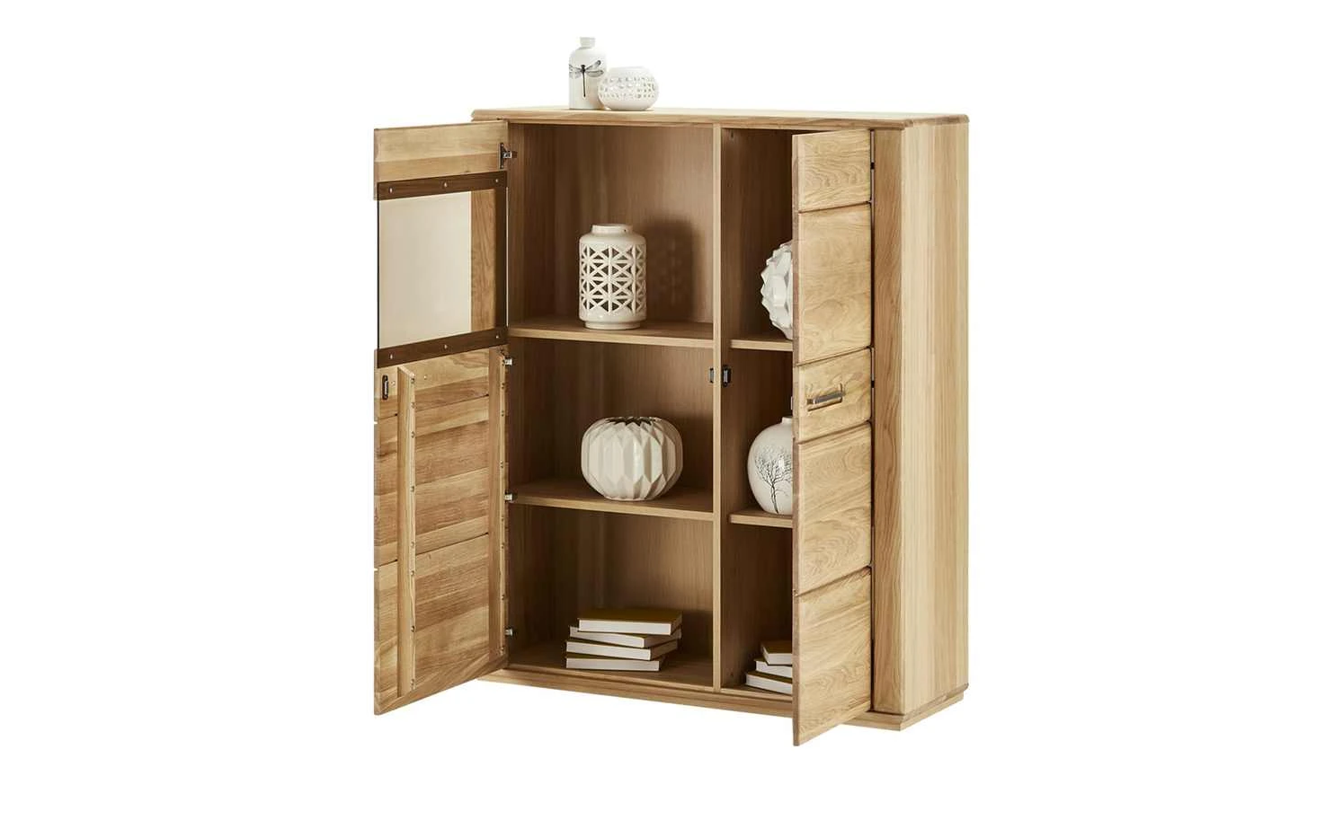 Viel Platz für Geschirr, Gläser und Tischwäsche bietet Ihnen das Kombi-Highboard Dio. Hinter den beiden Drehtüren stehen Ihnen insgesamt acht Fächer zur Verfügung. Durch den Glasausschnitt in der Tür haben Sie einen freien Blick in eines der Fächer. Ideal um dort besonders edle Lieblingsstücke in Szene zu setzen. Die Front des Kombi-Highboards besteht aus stabilem Massivholz. Der Korpus ist hochwertig furniert.
