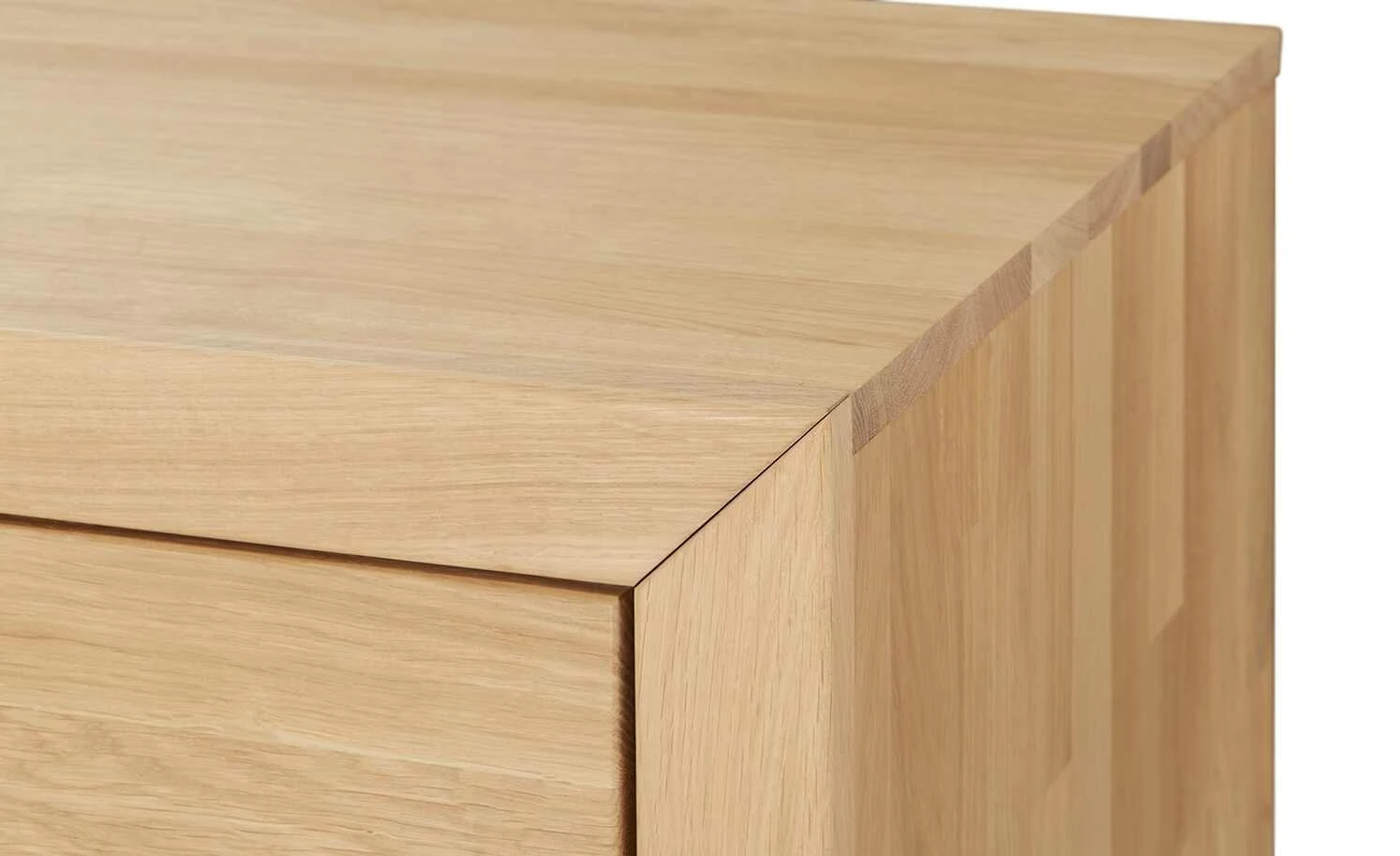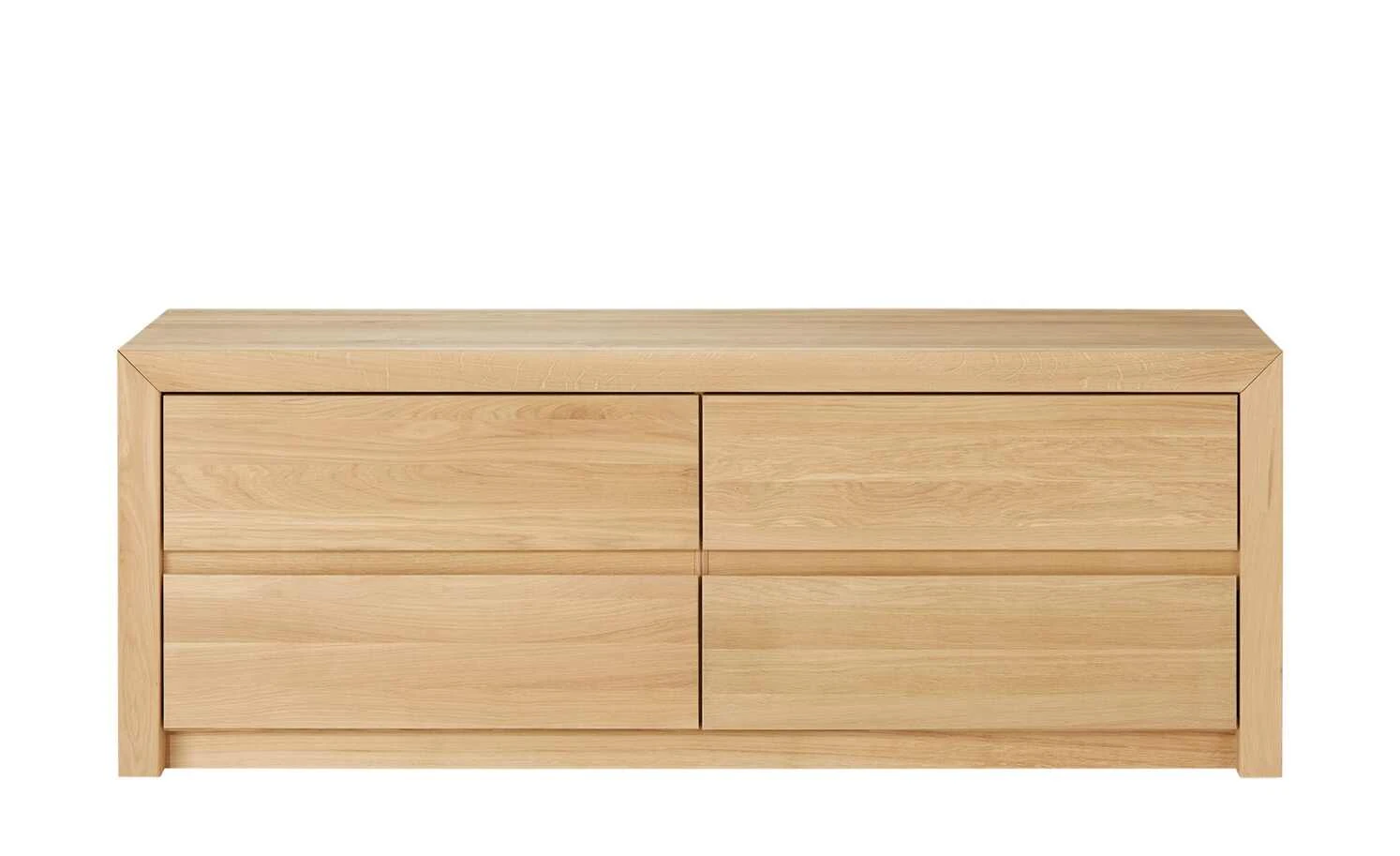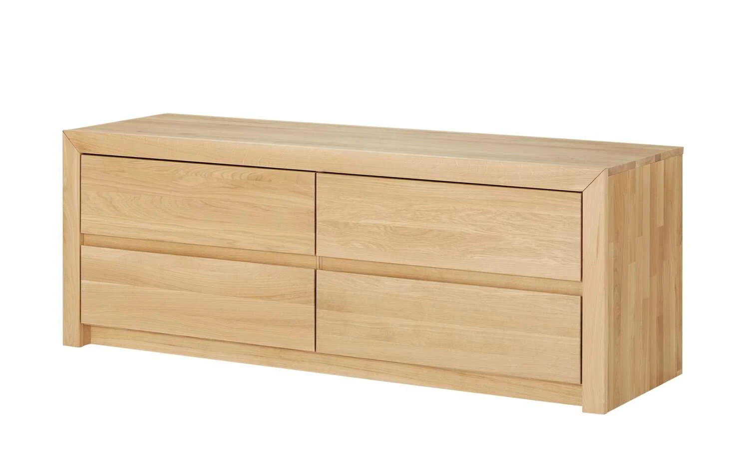 Helles, freundliches Massivholz zeichnet dieses TV-Lowboard aus. Das schön gemaserte Holz aus Eiche Bianco sorgt für natürliches Flair und kann auch zu vorhandenen Möbeln kombiniert werden. Neben der Stellfläche von 51 x 163 Zentimetern bietet das Lowboard auch Stauraum in vier Fächern. Nutzen Sie die oberen beiden Schubfächer für Fernbedienungen und Zubehör und lagern Sie Snacks für den nächsten Filme-Abend ganz einfach hinter den unteren beiden Klappen.